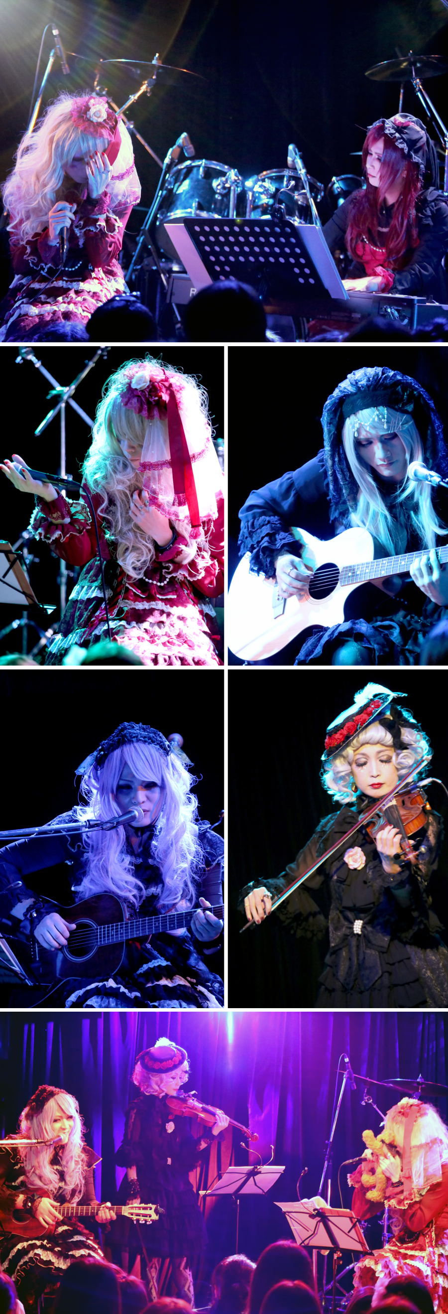 「今日はあえてソアージュとでも名乗りましょうか」、舞台上のメンバーはみな、「Angelic pretty」のロリータ服を身にまとっていた。「みなお気づきの通り、すでに悪夢が始まっております」という手鞠の言葉通り!?の、ここでしか見られないメンバーたちの姿は、とても美しくも新鮮に瞼へ飛び込んできた。